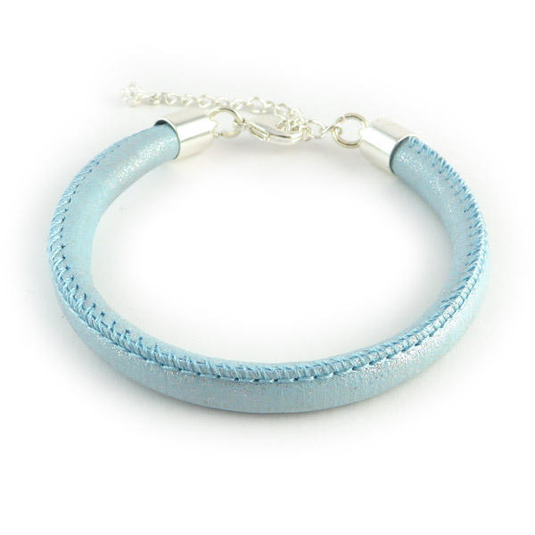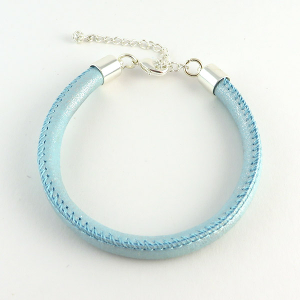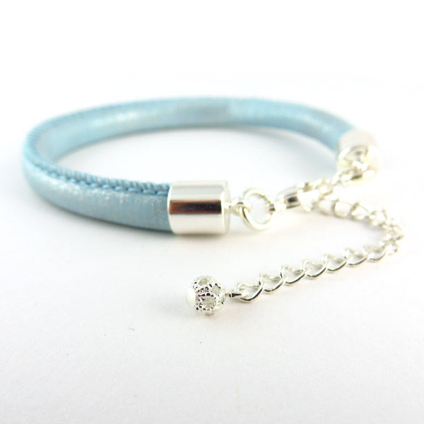 Handgemaakte armband van gestikt imitatie leer in de kleur metallic Turquoise blauw met zilverkleurige DQ eindkapjes. De armband kan op maat gemaakt worden met een kettinkje dus past altijd.