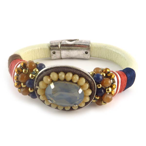 Armband wit- en blauwtinten Leren armband met mooie grote steen, een echte eyecatcher. De armband is afgewerkt met een magneetsluiting. Maat: ca 18 cm. Prijs€ 14,95 Artikel momenteel uitverkocht Aantal