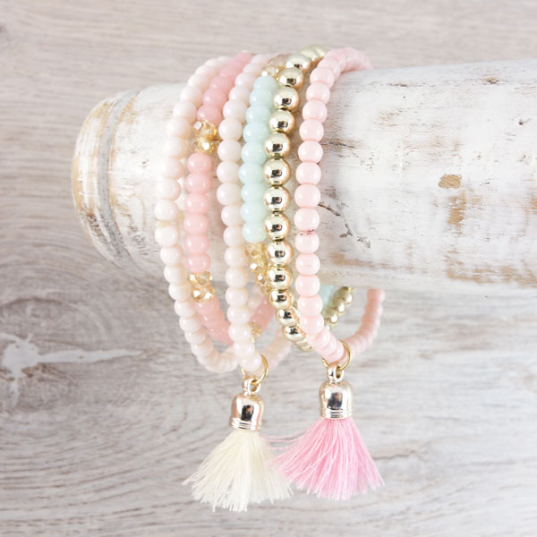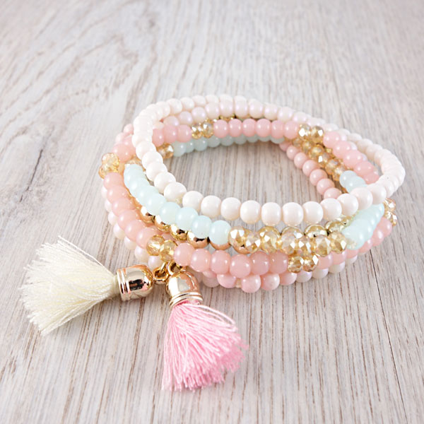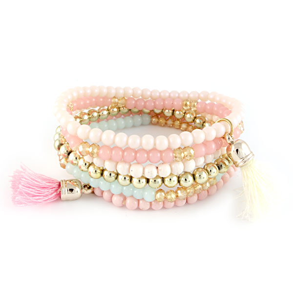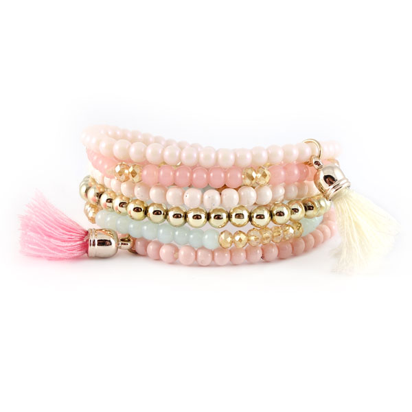 Deze mooie set kralenarmbandjes in de kleur roze zijn helemaal in deze zomer. De roze kralen worden mooi gemixt met turquoise, goud- en parelmoerkleurige kralen. Daarnaast is het mooi afgewerkt met een kwastje en facetkraaltjes. De armbanden zijn elastisch dus passen goed om iedere pols en zijn nikkelvrij.