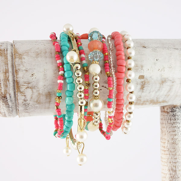 Deze mooie set kralenarmbandjes in de modekleuren turquoise en rose zijn helemaal in deze zomer. De armbanden zijn elastisch dus passen goed om iedere pols en zijn nikkelvrij.
