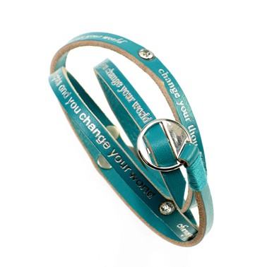 Echte leren armband met de tekst "Change your thoughts and you change your world" met kristallen stenen. Leuk om los te dragen of om te combineren. De armband heeft de kleur petrol en is ca. 62 cm lang.