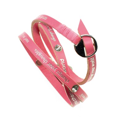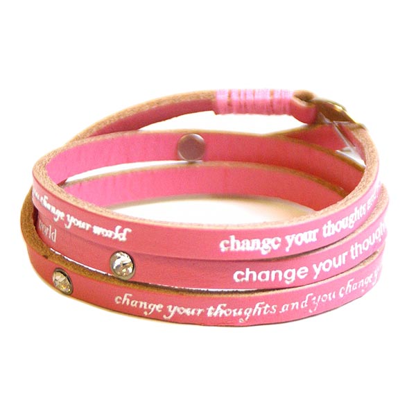 Echte leren armband met de tekst "Change your thoughts and you change your world" met kristallen stenen. Leuk om los te dragen of om te combineren. De armband heeft de kleur roze en is ca. 62 cm lang.
