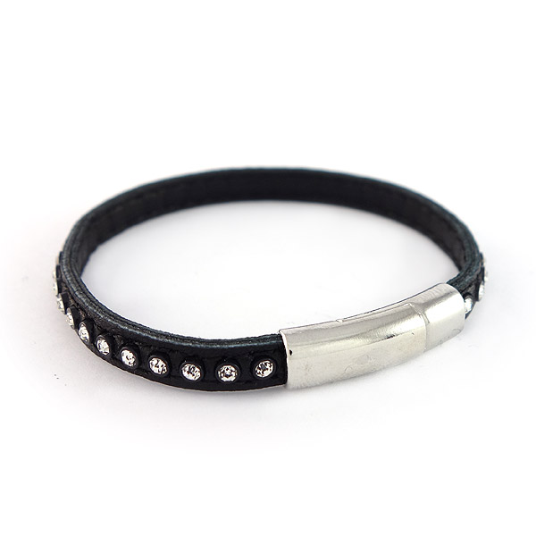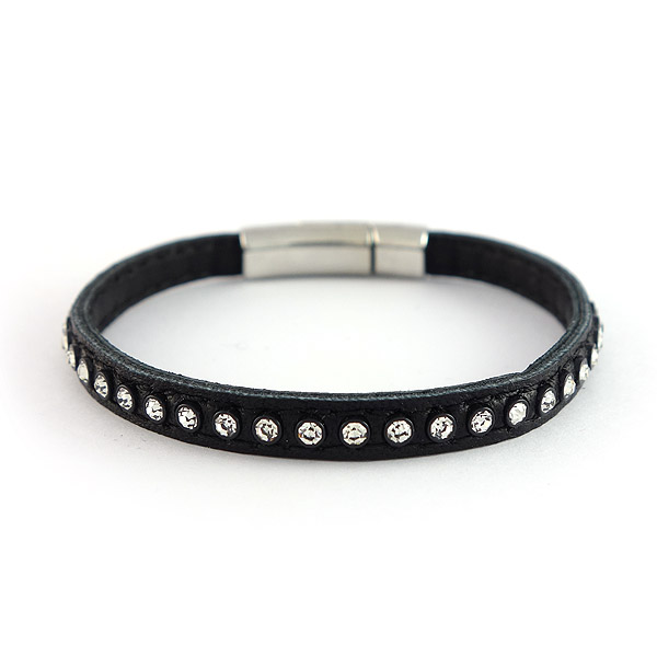 Mooi afgewerkte leren armband met swarovski steentjes in de kleur off white. De armband wordt op maat voor je gemaakt. Je bepaalt de juiste maat door je pols strak te meten. De armband is ca. 8 mm breed en afgewerkt met een roestvrijstalen sluiting.