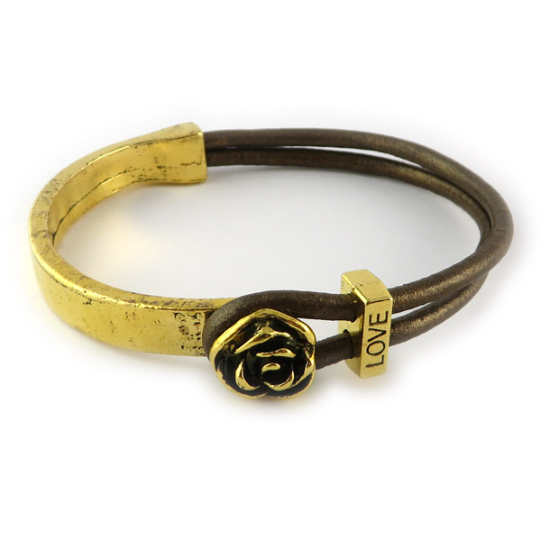 Stijlvolle en tijdloze Love armband met gouden bloem. De Love armband bestaat uit een goudkleurige beugel en leren koord in de kleur bronze brown. De armband is verkrijgbaar in verschillende maten. Je bepaalt de juiste maat door met een lint strak om je pols te meten.