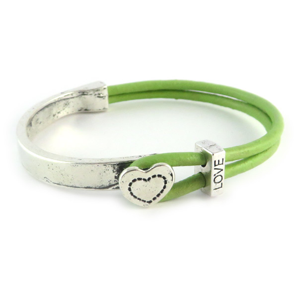 Stijlvolle en tijdloze Love armband met antiek zilveren hart. De Love armband bestaat uit een antiek zilveren beugel en leren koord in de kleur peridot green. De armband is verkrijgbaar in verschillende maten. Je bepaalt de juiste maat door met een lint strak om je pols te meten.