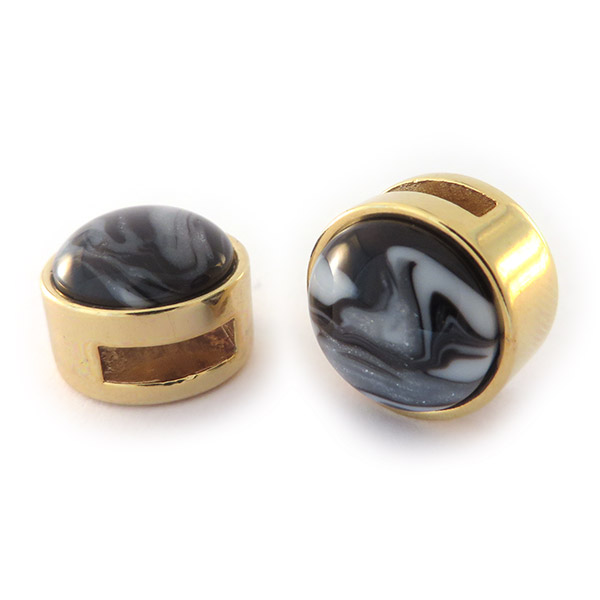 Slider goud met cabochon fantasia zwart wit Deze slider past op alle smalle (8 mm) leren armbanden van Cuoio en de Ibiza armbandjes. De structuur van deze cabochon is uniek en kan daarom afwijken van de foto. Prijs€ 2,95 Aantal