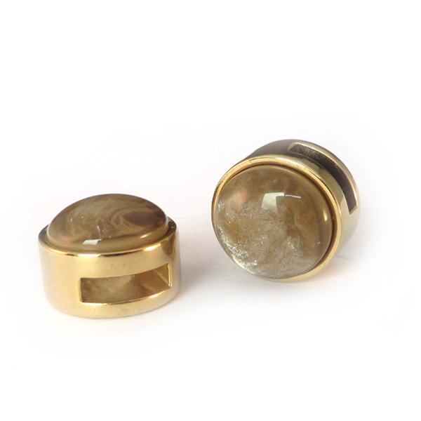Slider goud met cabochon pearl shine tawny birch brown Deze goudkleurige slider past op alle smalle (8 mm) leren armbanden van Cuoio en de Ibiza armbandjes. Prijs€ 2,95 Aantal