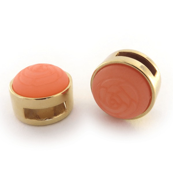 Slider goud met cabochon roos matt rose peach Deze goudkleurige slider past op alle smalle (8 mm) leren armbanden van Cuoio en de Ibiza armbandjes. Prijs€ 3,95 Aantal