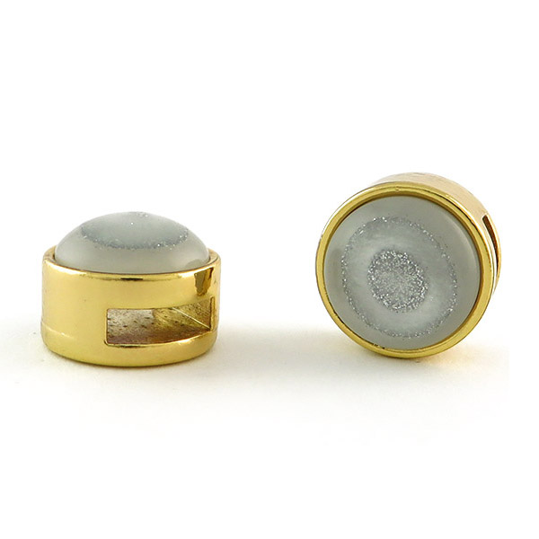 Slider goud met cabochon supernova silver shade Deze schuiver past op alle smalle (8 mm) leren Cuoio armbanden en het Ibiza lint. De structuur van deze cabochon is uniek en kan daarom afwijken van de foto. Prijs€ 2,95 Aantal