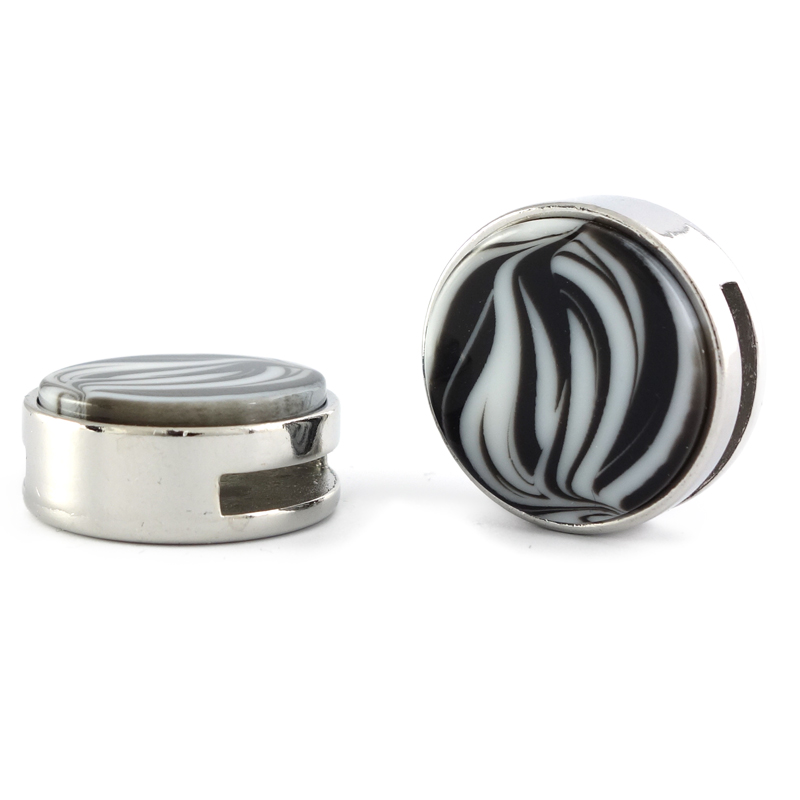 Deze zilverkleurige slider met cabochon zwart wit past op alle brede (15 mm) leren armbanden.