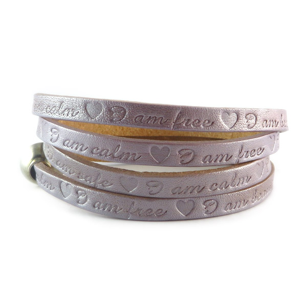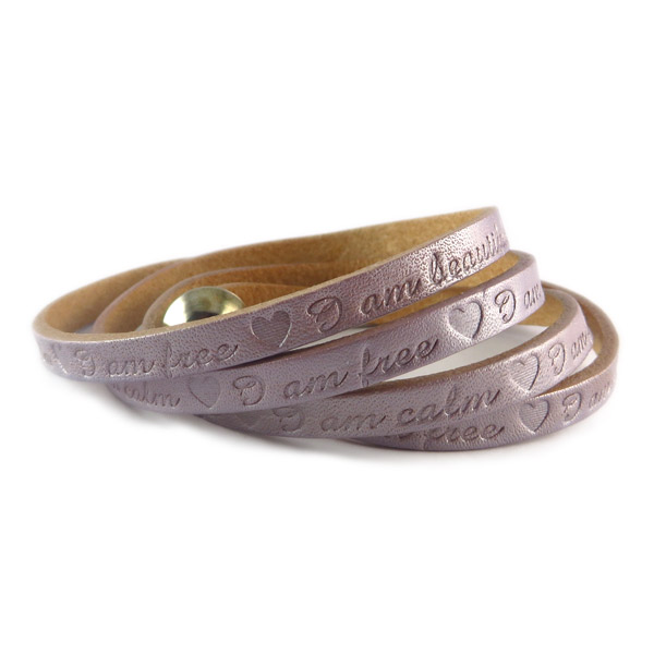 I am beautiful, I am Happy, I am loved, I am safe, I am calm, I am free zijn de mooie uitspraken die op deze leren armband in paarse kleur staan. De armband sluit met een magneet en past daardoor prima om iedere pols.
