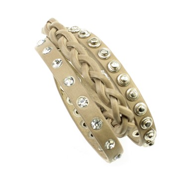 Mooie leren wikkelarmband met studs en glimmers. Leuk om los te dragen of om te combineren. De armband is ca. 62 cm lang en heeft de kleur beige.